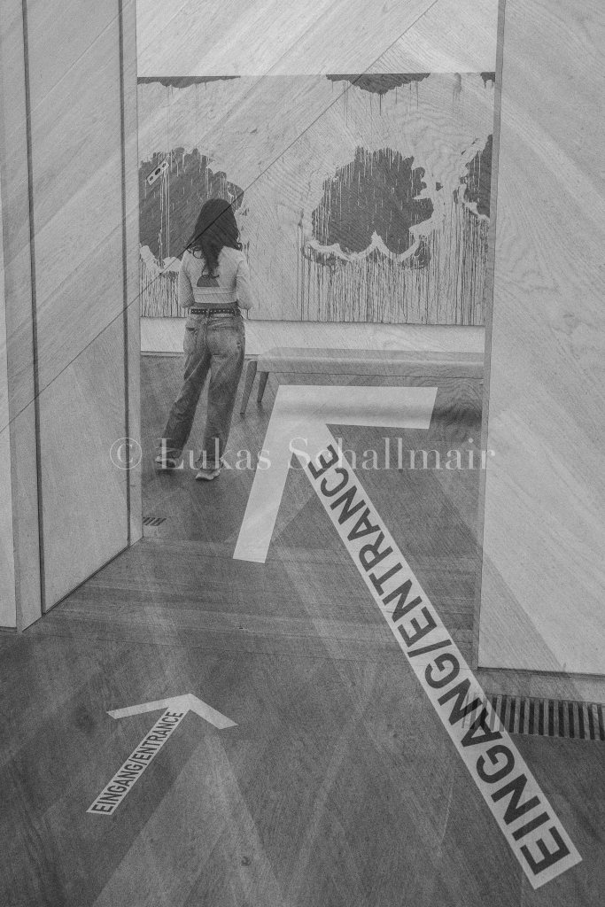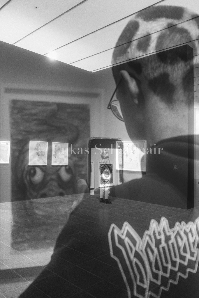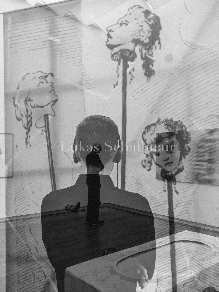 In meinen Doppelbelichtungen verschränken sich diese Ebenen: Menschen, die sich in ein Gemälde oder eine Skulptur vertiefen, werden durch die Überlagerung selbst Teil des Kunstwerks und gleichzeitig zu Motiven meiner eigenen Fotografie.
